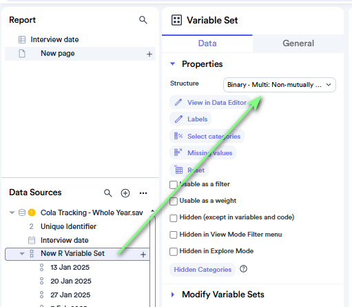 - Select the "New R Variable Set" and go to Data > Properties > Structure and select Binary-Multi: Non- mutually exclusive categories: