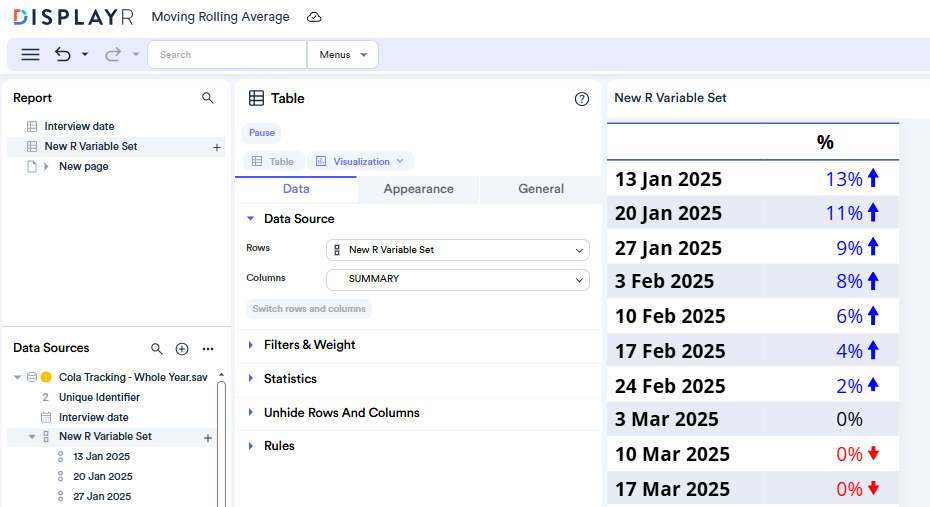 # Step 1: Update the code # Define Date/Time Variable name Date <- intdate #Define the start & end dates using format YYYY/MM/DD #In this example the start date is 2024/01/01 as per the table above #The end data is 52 weeks after; 2025/01/01 minDate <- "2024/01/01" maxDate <- "2025/01/01" # Step 2: Generate weekly columns (week commencing = Monday) weeks <- seq(as.Date(minDate), as.Date(maxDate), by = "week") # Step 3: Build 10-week rolling indicator df_matrix <- sapply(weeks, function(week_start) { window_start <- week_start - weeks(9) # 10 weeks beginning at the end of this week (inclusive) as.integer(Date >= window_start & Date <= week_start + days(6)) }) # Step 4: Format column names as "D Mon YYYY" formatted_colnames <- format(weeks, "%-d %b %Y") # Step 5: Final dataframe df_result <- as.data.frame(df_matrix) colnames(df_result) <- formatted_colnames df_resultNote: the code creates 10 weekly rolling averages. You can change the number of weeks by updating the number of weeks in Step 3 of the R code (e.g., week_start - weeks(9)).