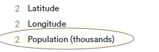 - Ensure that a numeric variable is available in your data set. In this example, the Population (thousands) variable is imported as numeric (you can tell by the number "2" before the variable name).